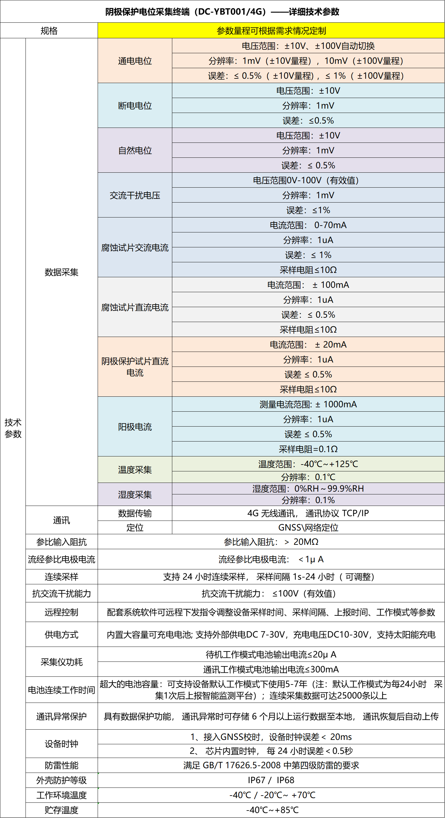 DC-YBT001/4G是一款户外金属管道阴极保护,,,,智能电位采集终端,,,,该终端系统由成都尊龙时凯科技有限公司自主研发,,,针对各领域中易腐蚀管道的,,阴极保护效果的智能远程监测的高科技产品。。传统的管道阴极保护的效果检测,,需要测试人员手执检测仪器(万用表等),,,,前往户外测试桩逐点逐位测试、、、、记录,,,,数据准确度难以保证,,,,并且耗工耗时,,野外跋涉还存在极大外派人员安全隐患。。。本产品的应用,,可完全取代人工测量,,,让此项工作更为高效精准。。。。